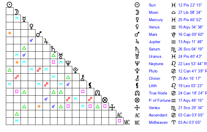| Pluto | 12 Cancer 42 | 2 Aquarius 57 | 13 Cancer 36 |