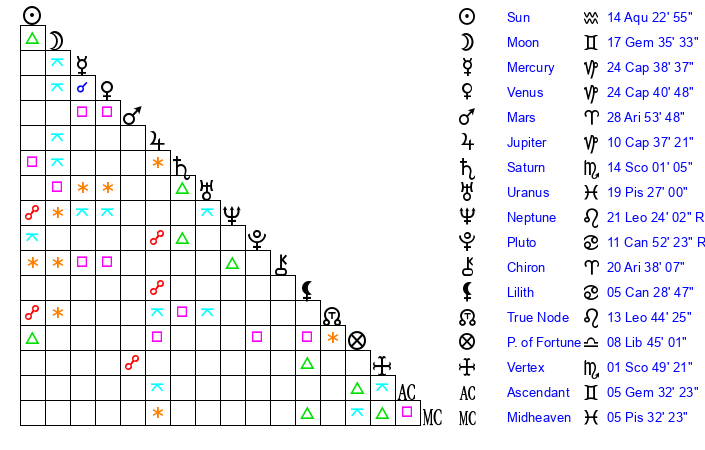 | Moon | 17 Gemini 36 | 23 Aries 41 | 16 Aquarius 26 |