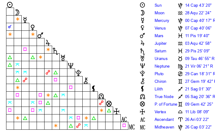 | Sun | 14 Capricorn 43 | 15 Capricorn 22 | 13 Aries 17 |