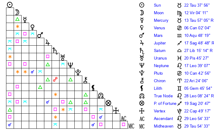 | Sun | 22 Taurus 38 | 23 Taurus 11 | 29 Leo 17 |