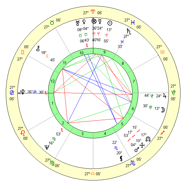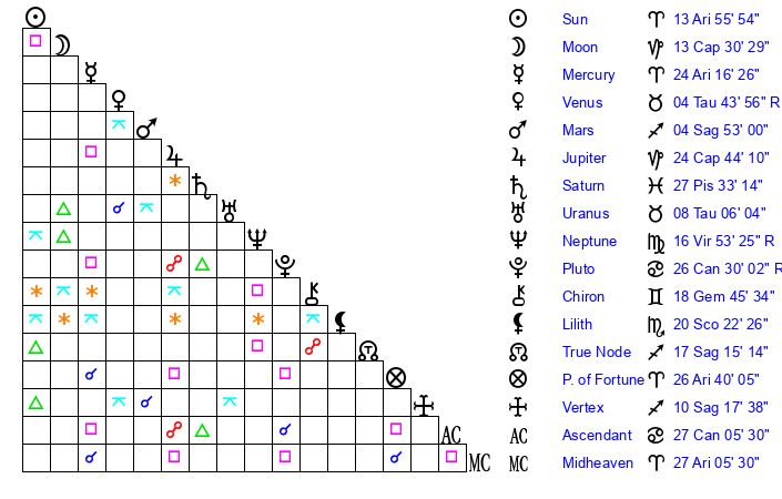 | Sun | 13 Aries 55 | 14 Aries 36 | 8 Cancer 51 |