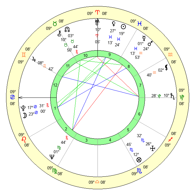 | Moon | 23 Cancer 15 | 9 Leo 35 | 19 Capricorn 35 |