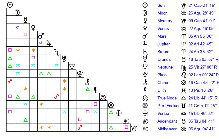 | Moon | 26 Aquarius 29 | 7 Cancer 18 | 4 Aries 20 |