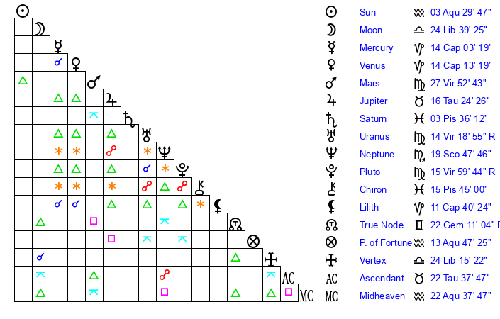 Pluto | 16 Virgo 0 | 1 Aquarius 47 | 14 Virgo 32 |