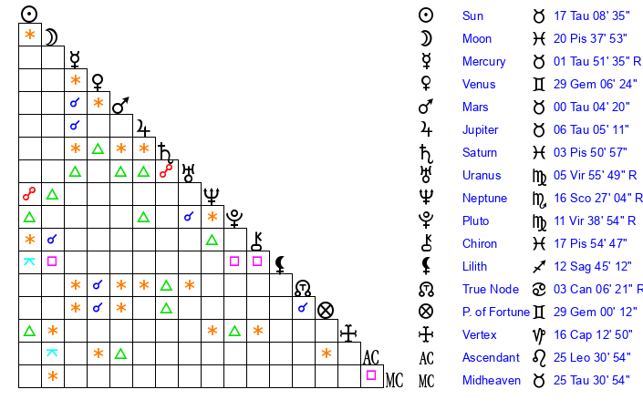 | Sun | 17 Taurus 9 | 17 Taurus 23 | 15 Cancer 35 |