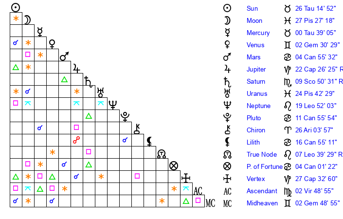 | Moon | 27 Pisces 25 | 23 Capricorn 20 | 13 Scorpio 14 |