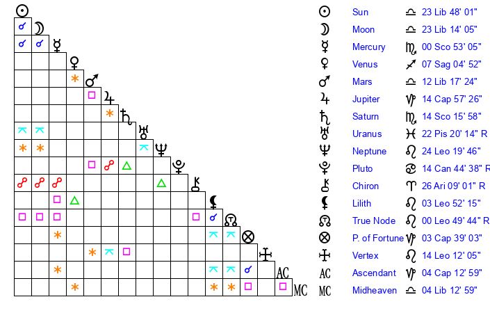 | Moon | 23 Libra 16 | 11 Virgo 53 | 0 Cancer 12 |