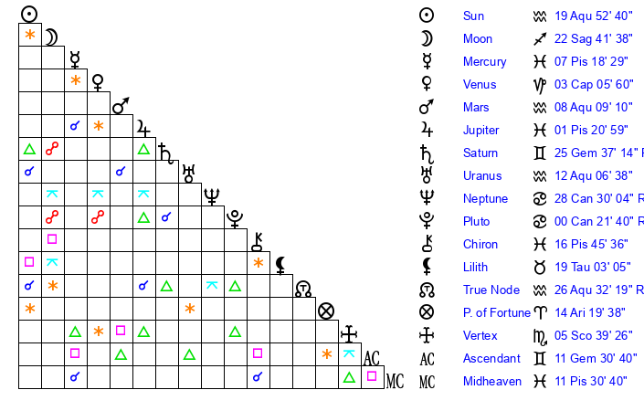 | Sun | 19 Aquarius 53 | 21 Aquarius 12 | 8 Gemini 11 |