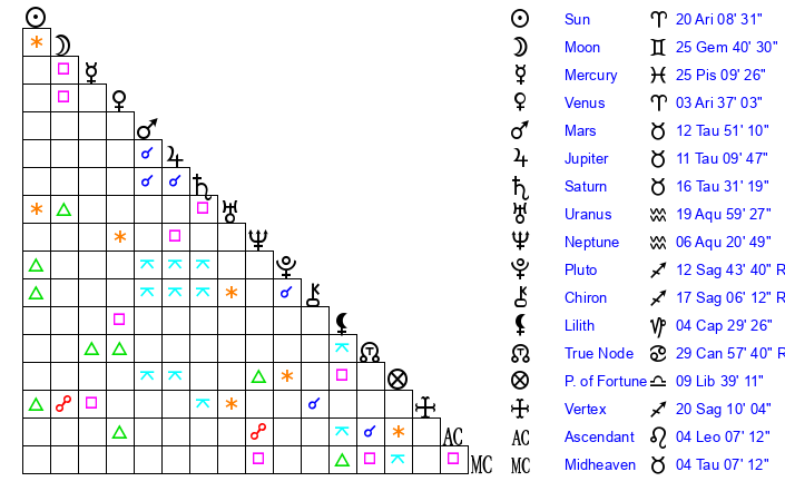 Uranus | 19 Aquarius 59 | 25 Taurus 11 | 20 Aquarius 38 |