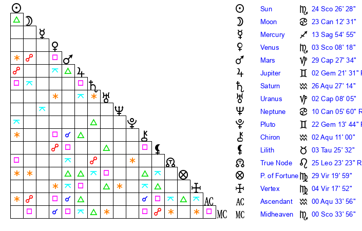 | Sun | 24 Scorpio 27 | 25 Scorpio 21 | 25 Pisces 57 |