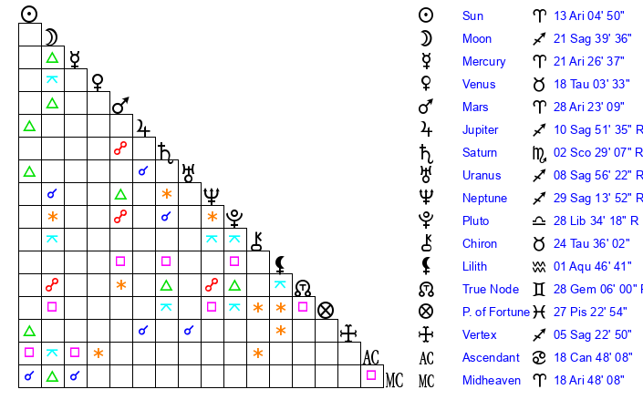 | Moon | 21 Sagittarius 36 | 22 Gemini 34 | 28 Gemini 22 |