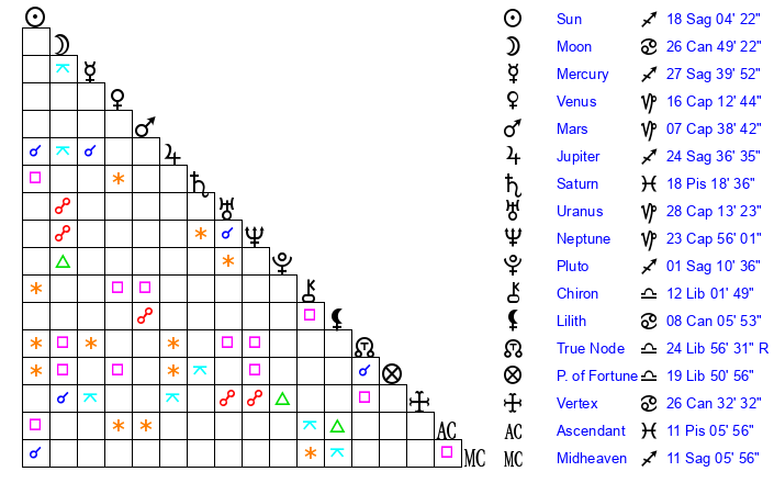 Sun | 18 Sagittarius 4 | 19 Sagittarius 3 | 17 Capricorn 36 |