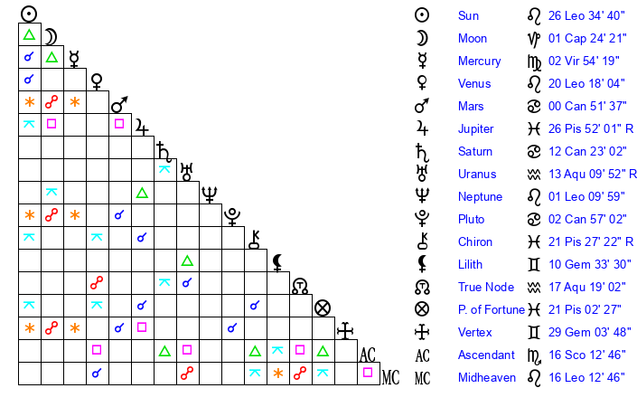 | Sun | 26 Leo 34 | 27 Leo 55 | 15 Sagittarius 32 |