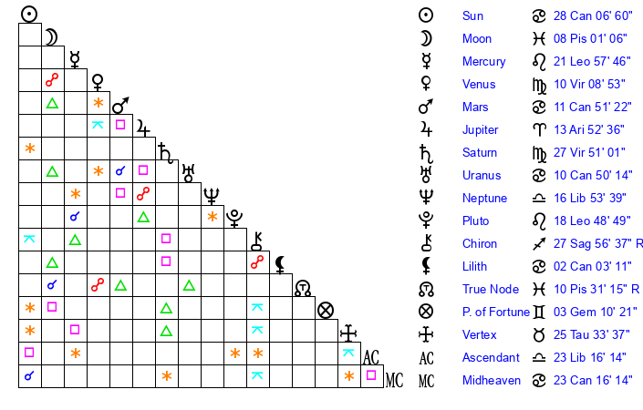 | Sun | 28 Cancer 7 | 29 Cancer 11 | 9 Libra 40 |