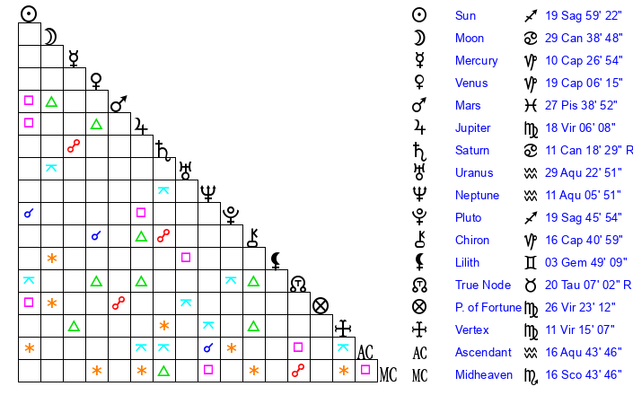 Pluto | 19 Sagittarius 47 | 0 Aquarius 30 | 20 Sagittarius 34 |
