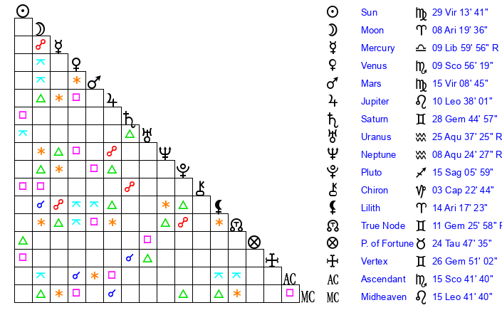 Mars | 15 Virgo 9 | 0 Scorpio 4 | 29 Virgo 48 |