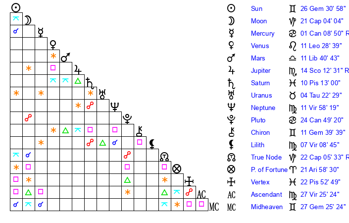 | Sun | 26 Gemini 31 | 27 Gemini 42 | 22 Virgo 53 |