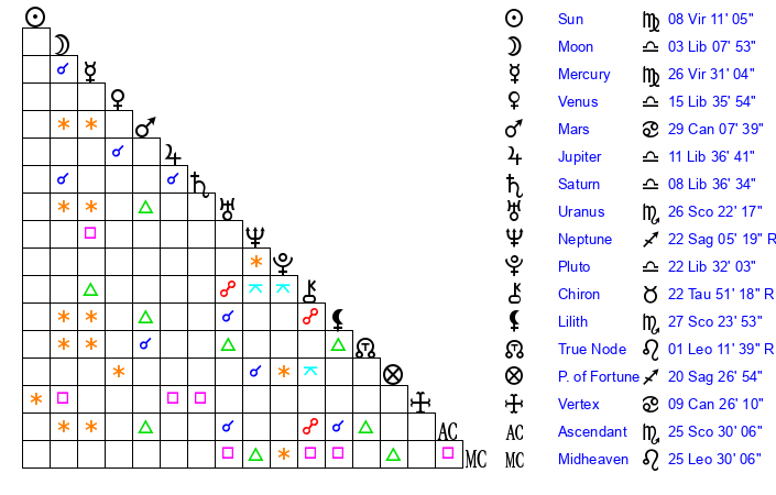 | Mercury | 26 Virgo 32 | 26 Leo 30 | 29 Libra 22 |