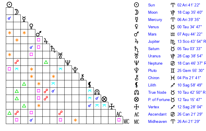 Sun | 2 Aries 42 | 4 Aries 3 | 22 Cancer 47 |