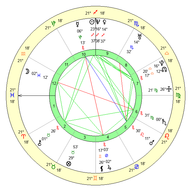 | Saturn | 0 Virgo 55 | 13 Pisces 25 | 28 Leo 46 |