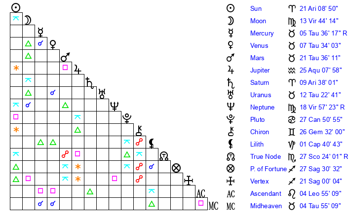 | Sun | 21 Aries 8 | 22 Aries 3 | 14 Cancer 54 |