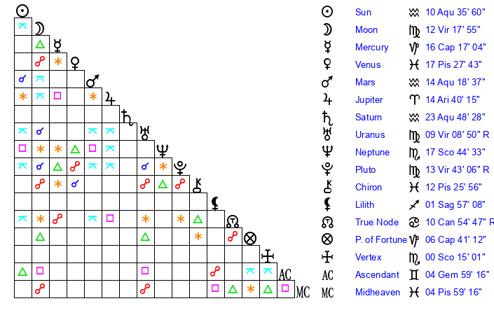 | Moon | 12 Virgo 18 | 7 Pisces 6 | 0 Sagittarius 34 |