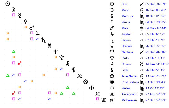 | Neptune | 21 Sagittarius 47 | 29 Pisces 24 | 23 Sagittarius 27 |