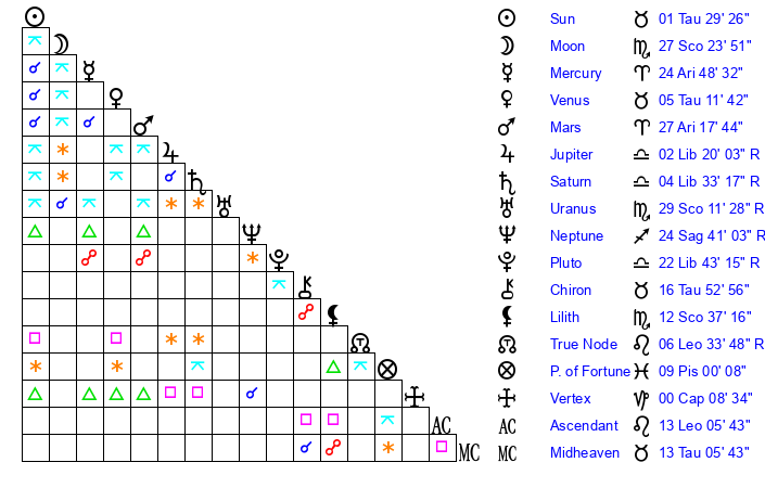 | Venus | 5 Taurus 12 | 26 Pisces 2 | 29 Gemini 19 |