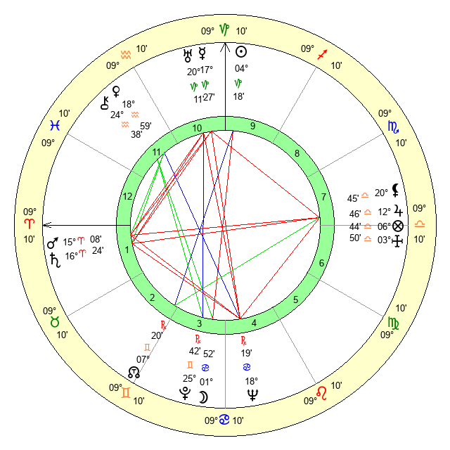 | Moon | 1 Cancer 56 | 16 Scorpio 19 | 17 Virgo 32 |