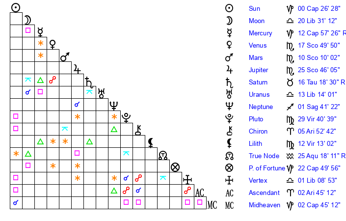Sun | 0 Capricorn 26 | 1 Capricorn 21 | 25 Aquarius 21 |
