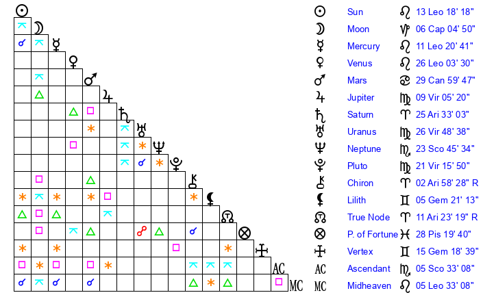 Sun | 13 Leo 18 | 13 Leo 31 | 8 Libra 34 |