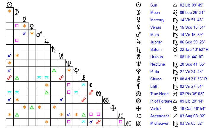 | Moon | 8 Leo 31 | 15 Scorpio 25 | 12 Leo 50 |