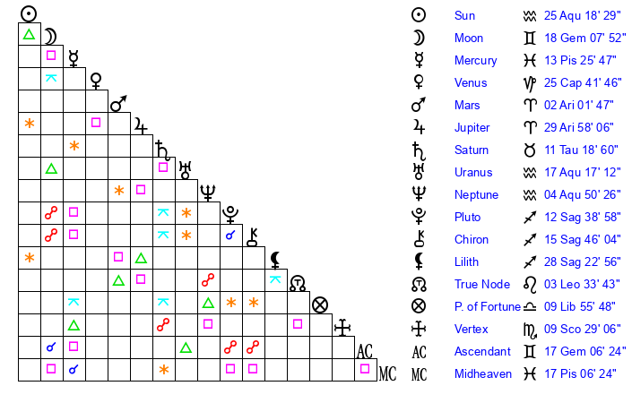 | Moon | 18 Gemini 19 | 20 Virgo 25 | 16 Taurus 46 |