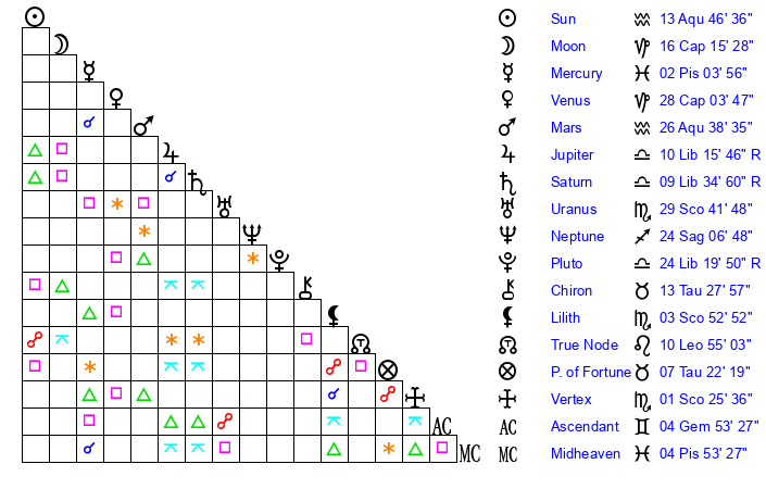 | Saturn | 9 Libra 59 | 17 Pisces 32 | 7 Libra 31 |