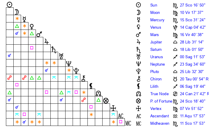 | Moon | 10 Virgo 15 | 21 Scorpio 22 | 5 Aries 52 |