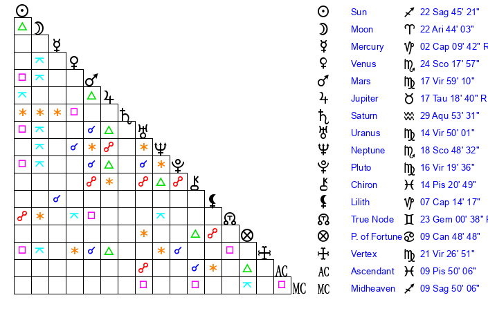 | Pluto | 16 Virgo 20 | 0 Aquarius 33 | 15 Virgo 34 |