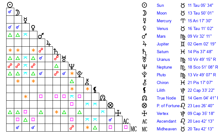Sun | 11 Taurus 6 | 11 Taurus 34 | 8 Cancer 40 |