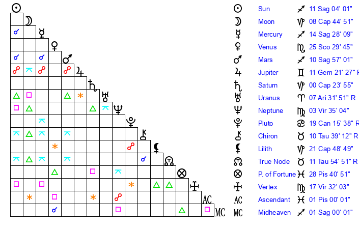 | Sun | 11 Sagittarius 4 | 12 Sagittarius 2 | 17 Pisces 24 |
