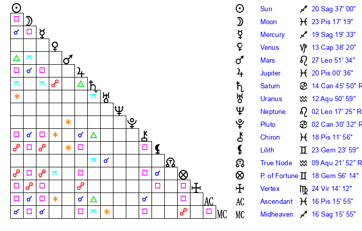 | Sun | 20 Sagittarius 37 | 22 Sagittarius 11 | 10 Aries 39 |
