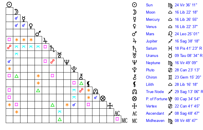| Sun | 24 Virgo 36 | 25 Virgo 3 | 23 Sagittarius 34 |