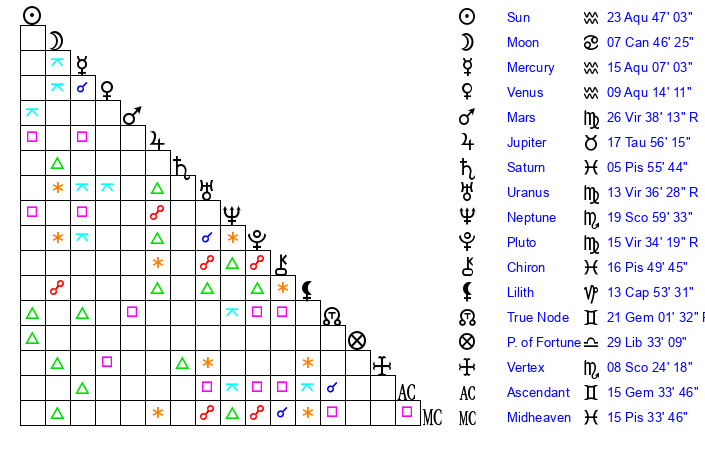 Pluto | 15 Virgo 34 | 2 Aquarius 25 | 14 Virgo 6 |