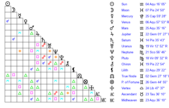 Venus | 6 Aquarius 58 | 21 Pisces 17 | 17 Aquarius 56 |