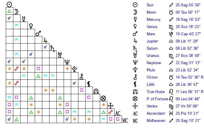 | Sun | 25 Sagittarius 56 | 26 Sagittarius 0 | 11 Aquarius 45 |