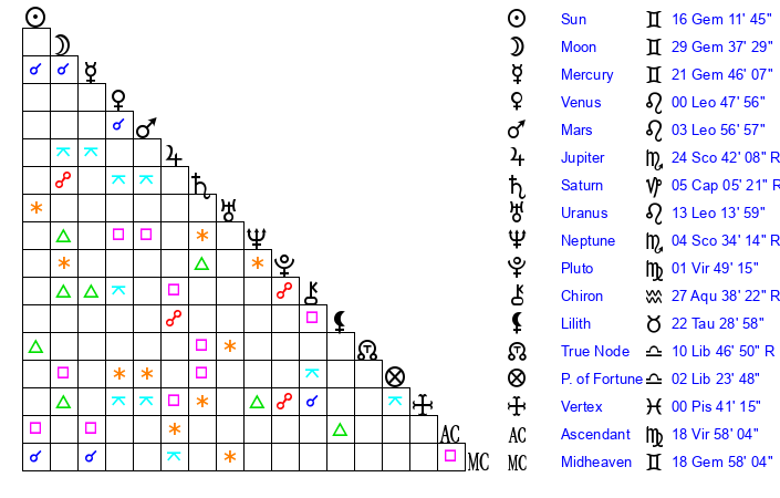 Mercury | 21 Gemini 46 | 27 Gemini 27 | 8 Leo 15 |