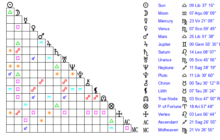 | Moon | 7 Aquarius 9 | 11 Aquarius 25 | 15 Scorpio 27 |