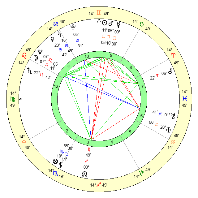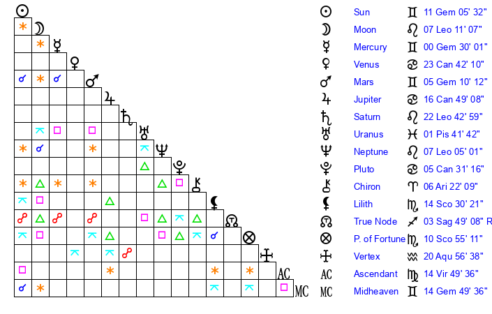 | Sun | 11 Gemini 5 | 12 Gemini 24 | 22 Virgo 46 |