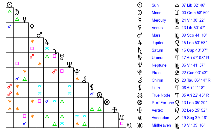 | Moon | 0 Gemini 57 | 28 Capricorn 27 | 16 Scorpio 56 |