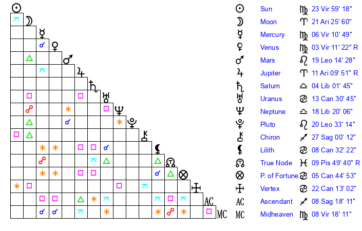 | Sun | 23 Virgo 59 | 25 Virgo 3 | 7 Sagittarius 41 |