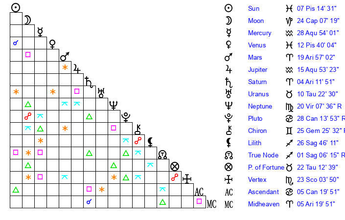 | Sun | 7 Pisces 14 | 8 Pisces 8 | 2 Gemini 39 |