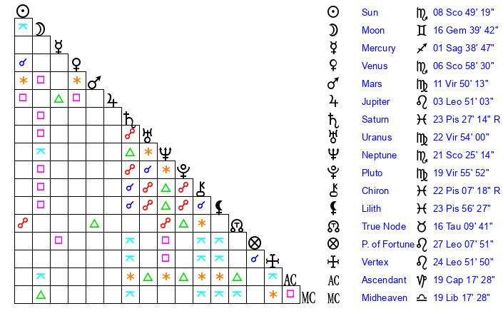 Moon | 16 Gemini 40 | 11 Scorpio 46 | 2 Leo 50 |